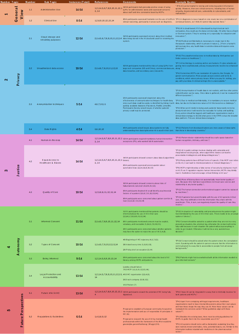 Ten participants raised concerns about GenAI hallucinations and how this could negatively impact patients’ quality of care. Eight participants also doubted whether these systems would be able to recognize psychosocial factors of a patient, which are often crucial to comprehensive patient assessments: “During a clinical visit, an AI system might not be capable of recognizing specific visible signs of a patient such as psychosocial details that are non-verbal and form part, not only of the health concern, but also of the human interaction, intimacy and trust between patient and doctor,” an ethical and legal expert (P10) explained. Additionally, patient comfort and trust were recurrently mentioned (8/14) as a major concern: “If patients feel uncomfortable with the use of AI systems in their care, they may withhold or limit the information they share with the practitioner. This, in turn, can negatively impact the quality of care they receive,” an ethical and legal expert (P9) noted.