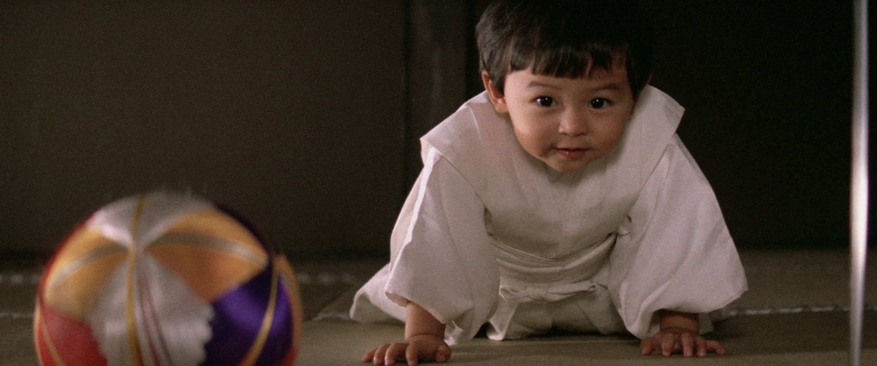 “Daigorō, you may choose your own way. Choose this dōtanuki sword and you’ll join me in the way of the assassin. Choose this ball, and I’ll send you to your mother in the nether world…Now, choose!” Adorned in a child-sized shiro-shōzoku 白装束 (a white kimono customarily worn before committing seppuku or ritualized suicide), Daigorō, the “cub,” clumsily crawls towards two meticulously placed objects that will determine his fate: the ball on the left and the sword on the right. In one of the few selective scenes in which silence is disrupted by an instrumental soundtrack, the solitary plucking of a shamisen string lingers, stretching into an agonizing silence.