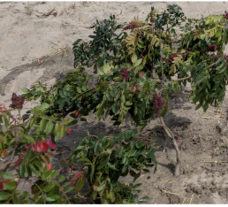 A native tree that has pinnately compound leaves that look like feathers. While they are usually green, leaves become bright red-purple in the fall. Also known for having bunches of small red fruits. |