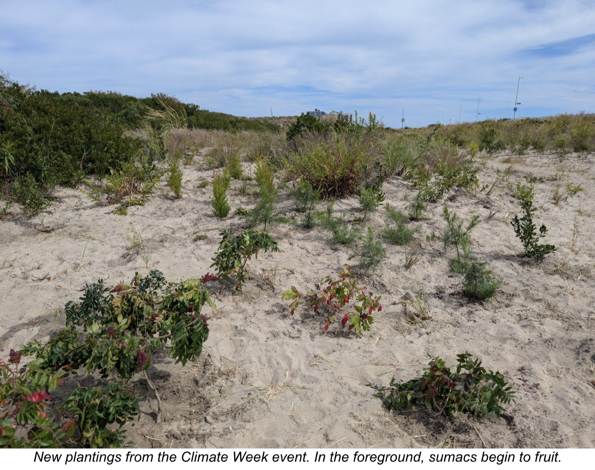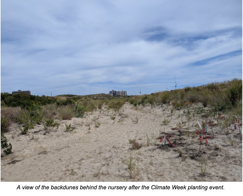 The Dune Squad’s efforts are only made possible through collaboration with community organizations and government agencies. Their Climate Week planting event, for example, was held in collaboration with the Surfrider Foundation, a group determined to protect the world’s oceans. The Dune Squad’s efforts are also guided by the “Greater Rockaway” Coastal Resilience Plan, created by RISE and supported by various government agencies and private firms, including the NYC Department of Parks and Recreation, the New York State Department of Environmental Conservation, the National Fish & Wildlife Foundation, the U.S. Army Corps of Engineers, WXY Architecture, and eDesign Dynamics. The plan aims to restore and maintain dunes across the Rockaways, spanning from Beach 17th through Beach 76th Street. This region was hit particularly hard by Hurricane Sandy in 2012, and efforts to rebuild the dunes stand not only as a shift towards more responsible urban design practices, but also as an attempt to build resilience and create a Rockaway that can handle the impacts of the next “100-year storm.” Coates acknowledges the Dune Squad’s work is just the start, explaining that “[e]ven if it is somewhat performative, I think that the concept is true... This is the beginning of the first steps of the project… In one hundred years, people will see what we’ve done right and can build a basis of knowledge.” Looking to the future, the group aims to foster biodiversity and resilience in a coastal community with a unique history characterized by both development and destruction.