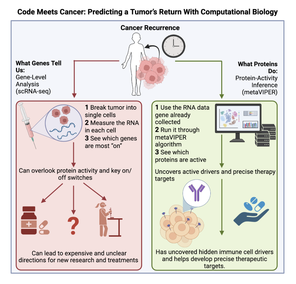 This is where the metaVIPER algorithm comes in. Instead of only reading the menu, metaVIPER looks at what dishes are coming out of the kitchen. It looks for the effects proteins are having and works backward to figure out what genes are functionally in control, even without seeing them directly. Unlike lab-based techniques, metaVIPER’s strength lies in its ability to computationally integrate data from multiple experiments and compare thousands of protein activity profiles at once, revealing control patterns that might otherwise stay hidden.
