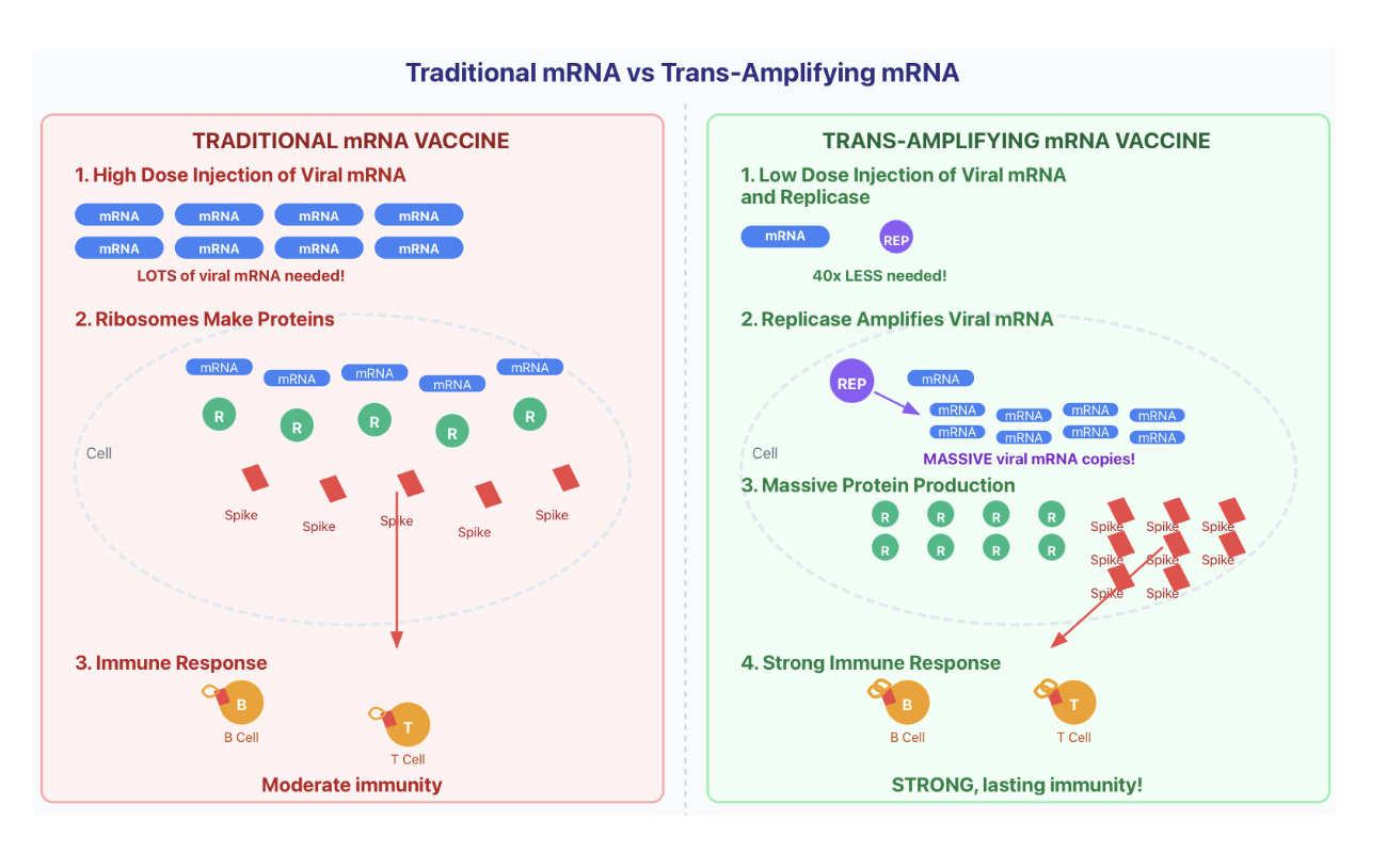 In June, researchers at the University of Pittsburgh and Pennsylvania State University identified a new "trans-amplifying" mRNA vaccine platform which uses self-replicating RNA to amplify immune responses within the body (University of Pittsburg, 2025). This technology directly addresses many concerns that fuel vaccine hesitancy while offering an immediate example of the innovation Kennedy’s funding cuts eliminate. Unlike traditional mRNA vaccines used against COVID-19, which require high doses and frequent reformulation to address constant viral mutations, trans-amplifying vaccines use two molecular components that work in tandem. The first, an antigen sequence, provides instructions to the immune system to recognize and neutralize the virus. The second, a replicase sequence, acts as a biological amplifier. The replicase allows cells to generate more copies of the antigen so the vaccine requires up to forty times less mRNA than current vaccines. For skeptics worried about vaccine components and dosing, this highlights a dramatic reduction in what the body receives while maintaining effectiveness.