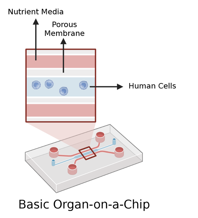 Enter Organ-on-a-Chip (OoC) Technology — a remarkable innovation that merges biology and engineering to simulate the functions, structure, and biochemical environment of human organs on a miniature scale. Often no bigger than a USB drive, OoCs essentially contain a network of precise channels that work with fluids as small as one trillionth of a liter and a chamber lined with human cells sourced from either tissue donations or differentiated stem cells (Leung et al.) Comparable to the vascular system, the channels deliver nutrients by running liquid over the human cells, allowing for direct experimentation on the cell's biochemical processes. In addition to housing organ-specific cells, some chips have engineered features to replicate the defining characteristics of their organ, providing even more realistic modeling. For example, a lung-on-a-chip provides a cyclic stretching motion on the cell tissue to mimic what occurs during breathing, a heart-on-a-chip uses a rhythmic pulse and electrical stimulation on the cells similar to how a heart beats, and a gut-on-a-chip uses a controlled flow of nutrients to model the interaction with food (Wyss; Singh et al.).