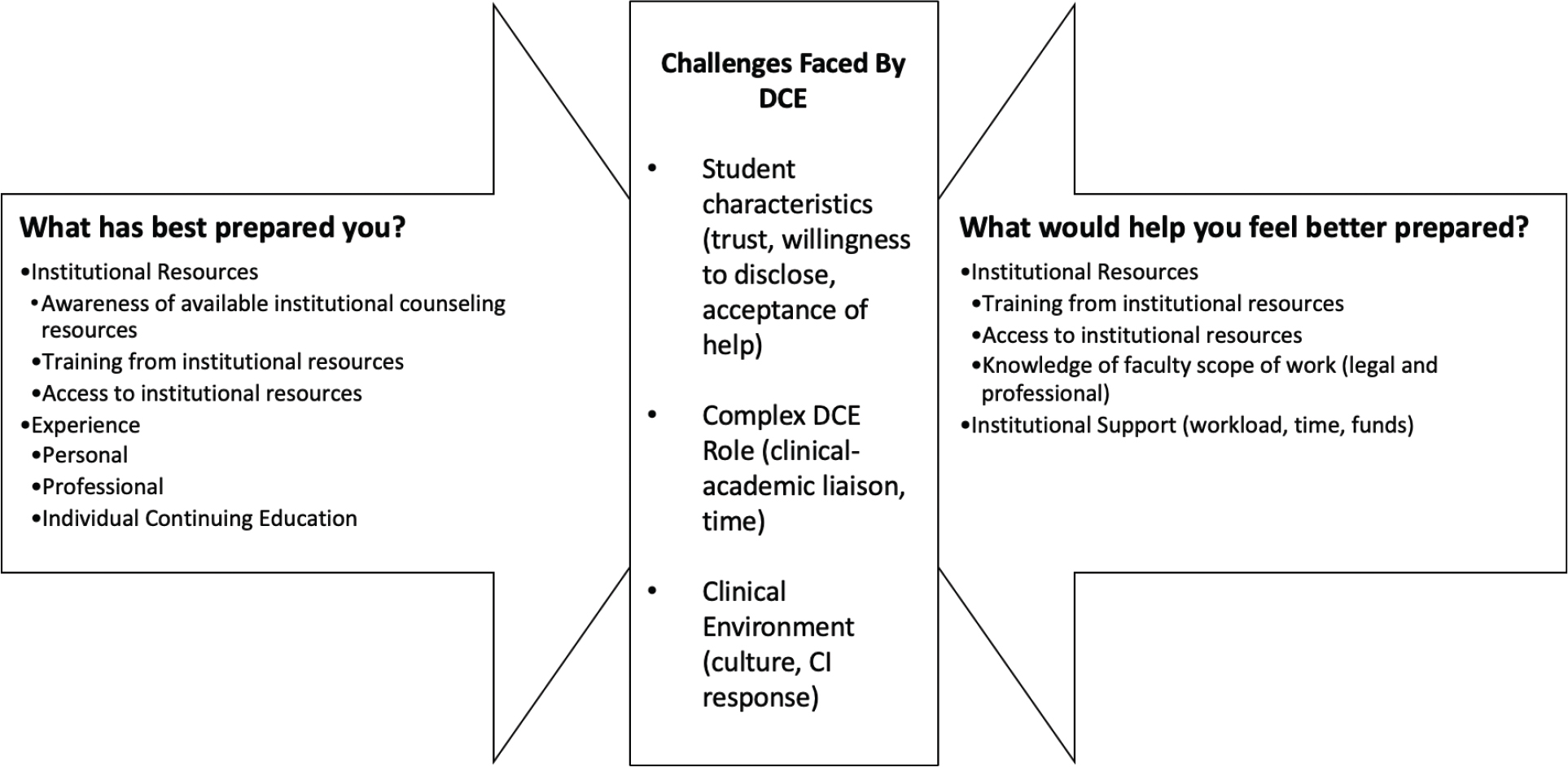 DCEs who did not feel prepared also indicated that more training/education would be helpful. The subcategories included focused training on screening for mental health concerns and guidelines that exist for referring and supporting students in these situations. Respondents also indicated that understanding the scope of their professional role with regard to legal guidelines would provide preparation. Finally, DCEs commented frequently on the need for more institutional support, indicating that support of their time and workload to manage student needs would prepare them for these unique situations.