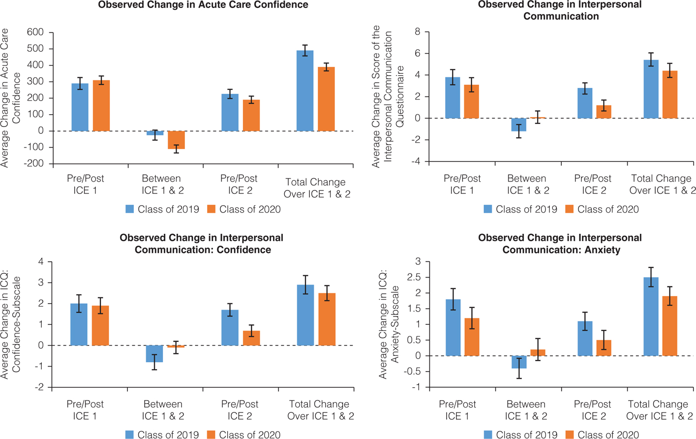 Results: There was a significant interaction on ACCS and ICQ by time. Students gained an average of approximately 440 points on the ACCS and 4.9 points on the ICQ over the course of both ICEs. However, there was not a statistically significant difference between cohort and either acute care confidence or interpersonal communication.