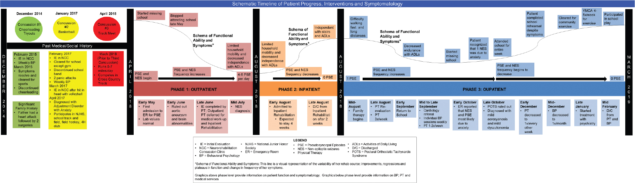 The patient, a 15-year-old student-athlete, with FNSD symptoms was referred to outpatient PT from an interprofessional pain management clinic. She presented with lower extremity pain; weakness; pseudosyncopal episodes (PSE); and decline in school, social, and athletic participation. She had a significant history of three concussions in 4 years. Behavioral psychology and/or PT successfully treated her first two concussions; however, her symptoms remained unresolved following her third concussion (Fig. 1). Her comorbidities included hypermobility syndrome, dysautonomia, and chronic pain syndrome. There was a significant family history of parental psychiatric and cardiac hospitalizations. She required skilled and highly collaborative interprofessional outpatient and inpatient rehabilitation for nearly 1 year to facilitate return to her prior functional level (Fig. 1).