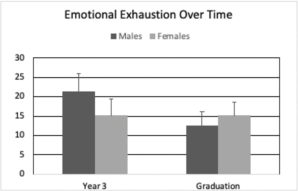 Split-plot factorial two-way analysis of variance (ANOVA) revealed a significant interaction effect between gender × time on EE scores, F(1,48) = 9.276, p = 0.004, see Fig. 1. Additional pairwise comparisons of simple effects indicated a significant effect of male gender on EE scores over time, χdiff = 8.83, p = ≤ 0.0001, d = 0.896; male scores significantly decreased from Year 3 to graduation. There were no significant differences between male and female student EE scores at each time frame: at Year 3, χdiff = 6.24, p = 0.049, d = 0.572, or at graduation, χdiff = 1.95, p = 0.432, d = 0.227. The main effect of gender on EE scores F(1,48) = 0.768, p = 0.385 was not significant. The main effect of time on cohort EE scores was significant, F(1,48) = 12.35, p = 0.001, d = 0.44, showing a significant decrease in exhaustion levels for the cohort overall from Year 3 to graduation.