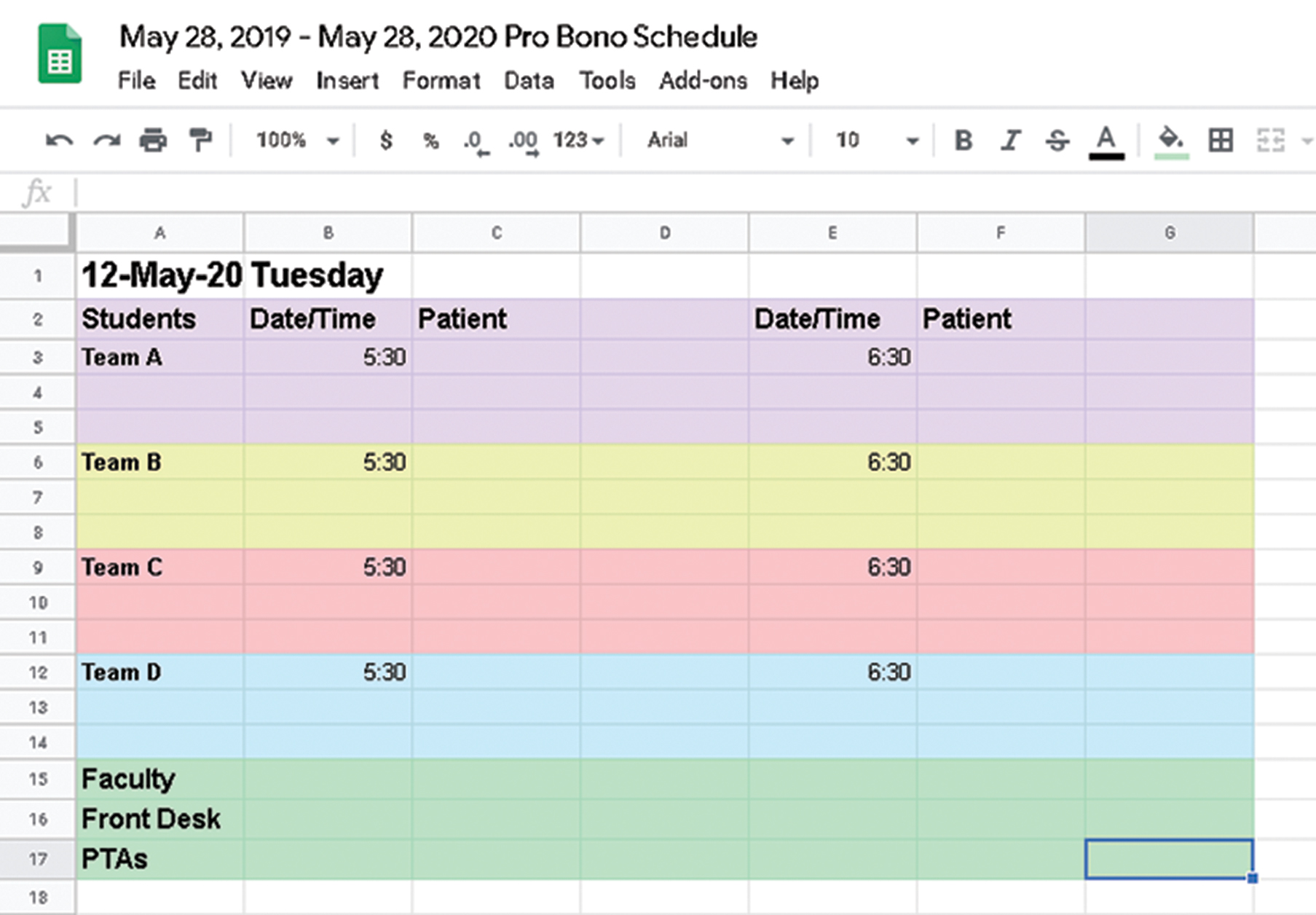 Fig. 1. Schedule example. Two times/week, 1–2 SPTs see two patients. Within the scheduling system, the student schedulers list the SPTAs that will be attending for the night as part of their rotation.