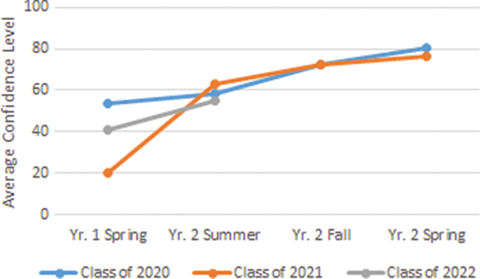 Fig. 4. A pro bono clinic questionnaire reported overall confidence improvements within each PT cohort each semester. (1) Performing a chart review on Web PT, (2) Introducing yourself to a patient, (3) Communicating with a family member / caregiver, (4) Communicating with a patient whose primary language is not English, (5) Performing a Subjective examination, (6) Examining a patient whose primary language is not English, (7) Choosing a functional outcome measure, (8) Performing Objective measures based on subjective findings, (9) Assessing the patient’s need for physical therapy, (10) Writing goals, (11) Developing a plan of care including number of recommended visits, (12) Choosing an appropriate ICD-10 code, (13) Performing interventions, (14) Billing for services performed, (15) Teaching the patient a home exercise program, (16) Discussing with patient expected progression, (17) Documenting on Web-PT, (18) Delegating to a PTA, (19) Teaching other students about patient care in the pro bono clinic, (20) Feeling prepared for your long-term clinicals, (21) Referring a patient to another provider.