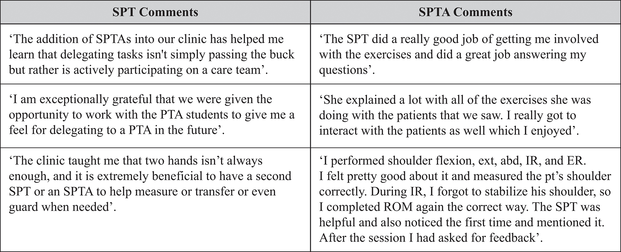 An unexpected benefit from this model also emerged as first-year SPTs were learning similar clinical skills at the same time in their program as the SPTAs. This has allowed for team-based psychomotor skill development and an appreciation for the knowledge and skill-set of both parties. Furthermore, SPTs have also learned skills related to teaching peers, helping to prepare them as future clinical instructors. The elements 7B, 7D12, and 7D15 within CAPTE require PT programs to prepare students for proper teaching and clinical instructor skills.10 The hybridized teams in this model of both first-year and second-year SPTs and the SPT-SPTA allow various opportunities to instruct clinical skills and practice.