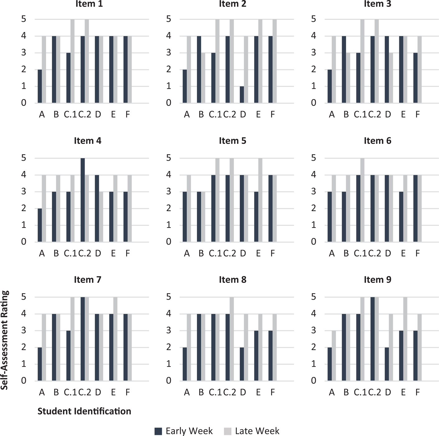 Fig. 1. Comparison of individual student ratings at early clinical weeks and late clinical weeks for each self-assessment item. Case series student PTs A and B were early program students participating in an integrated clinical education experience (ICE), while case student PTs C through F were placed in a terminal clinical experience following the conclusion of all didactic work.