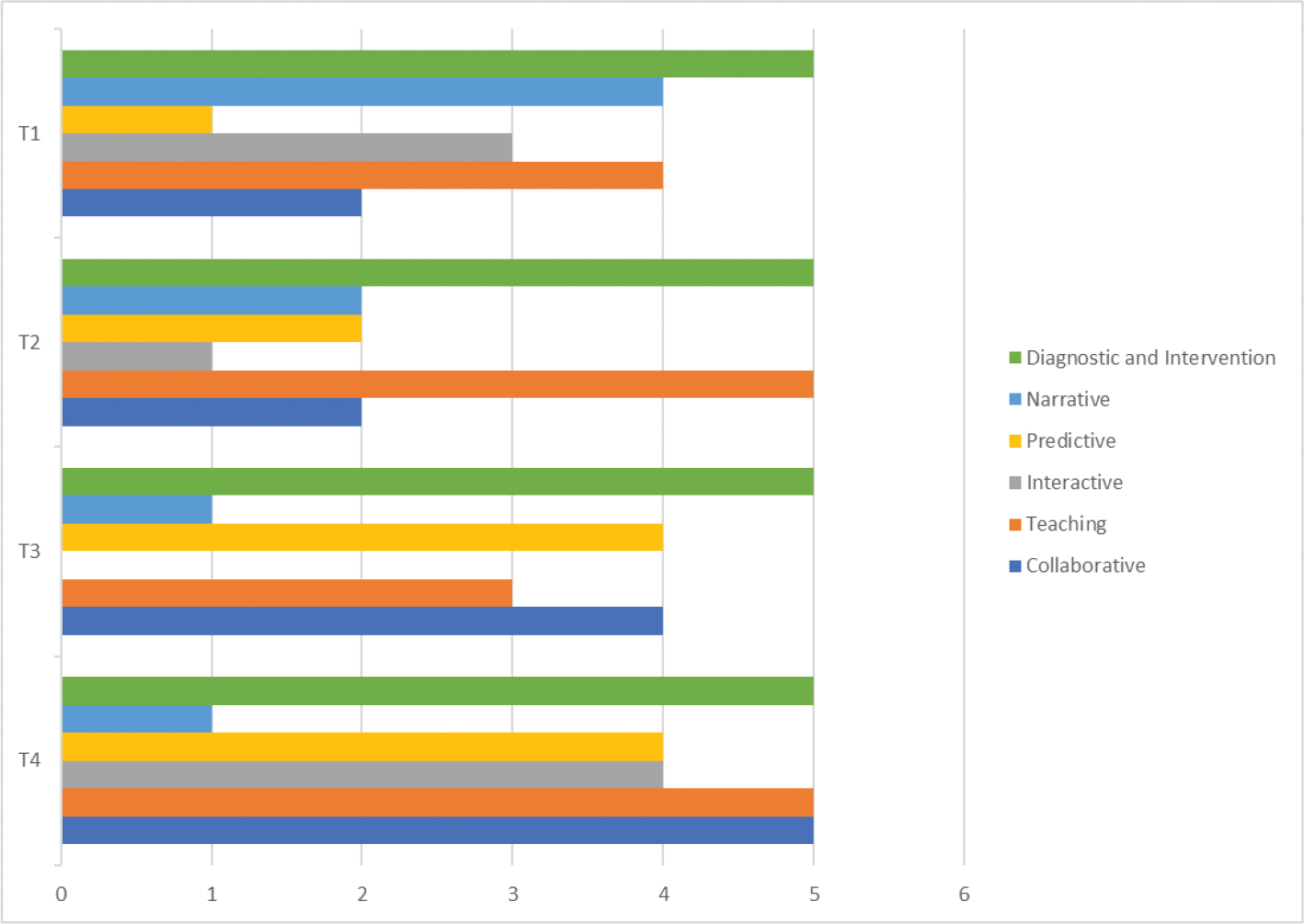 Researchers analyzed a total of 20 narratives completed at four time points. Using the established coding strategy based on the CRS model, researchers identified seven of the eight CRS strategies in resident narratives. Evidence of ethical reasoning was not identified in any of the narratives. Residents used an average of 4.8 CRS at the beginning and 5.8 near the end of the residency. Figure 1 highlights how, for instance, at Time 1 (T1, baseline reflective narrative) one out of the five residents used predictive reasoning but at Time 4 (T4, the final clinical reasoning assignment at the end of residency), four out of five residents were engaging in predictive reasoning with patients. Diagnostic and interventions procedures reasoning were used most frequently, whereas narrative reasoning was used infrequently. Collaborative reasoning showed the most development, with 100% of the residents leveraging it in their final reflective narrative.