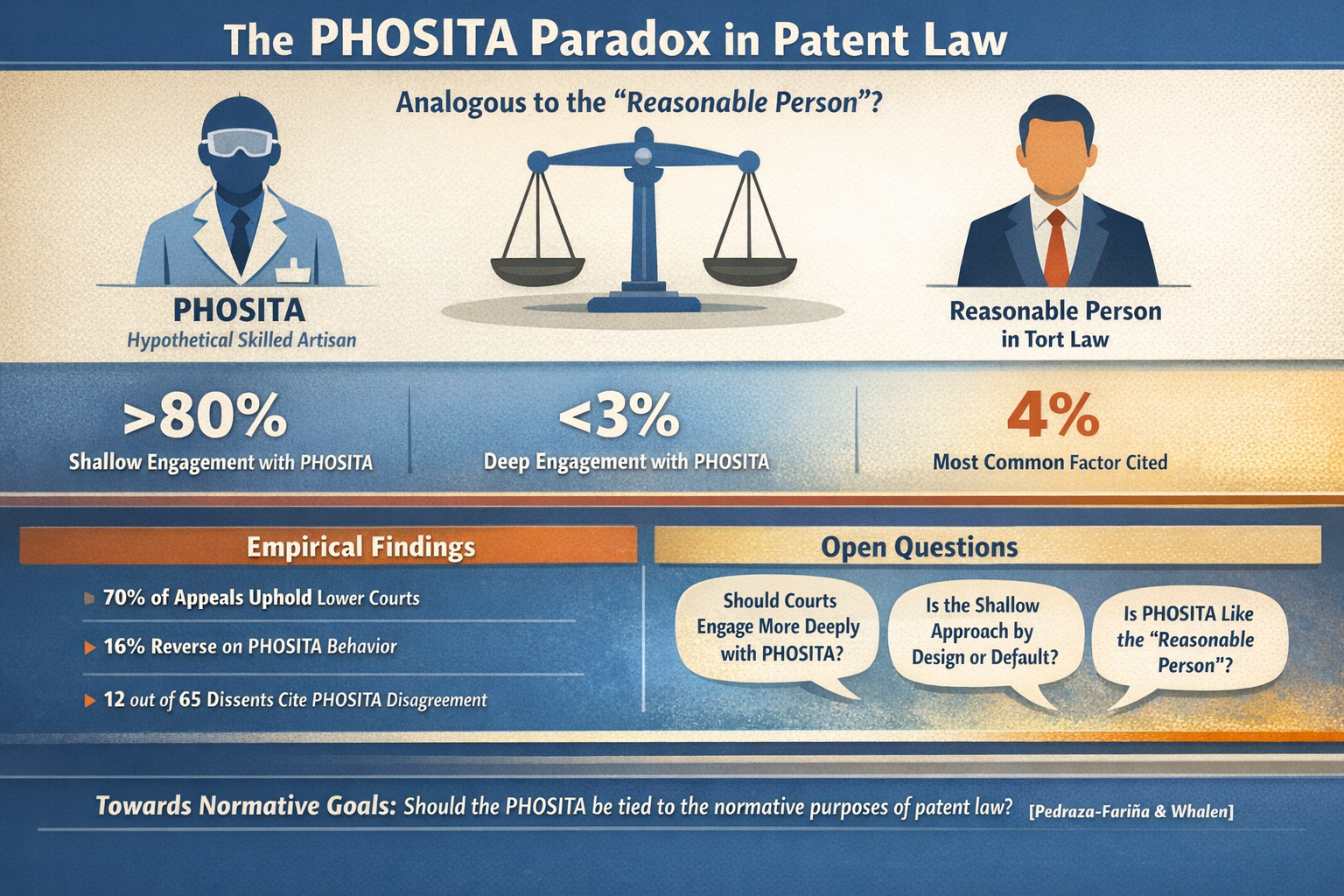 Pedraza-Fariña and Whalen’s findings suggest the PHOSITA is not nearly as consequential in practice as it is in theory. Comparing to the reasonable person, a significant portion of tort law literature posits whether their hypothetical person should serve an empirical or normative function, whereas patent law has remained relatively silent on this distinction. In fact, the authors suggest this uncertainty between the empirical and normative are why courts engage so shallowly with the PHOSITA.[17] That leaves us with certain open questions: Should courts engage more deeply with the PHOSITA? Is this predicament harmful to the practice of patent law, or is it deliberately designed this way? Is it even right to compare the PHOSITA to tort law’s reasonable person? Pedraza-Fariña and Whalen provide their own answer: the PHOSITA construct should be tied to the normative goals of patent law.[18]